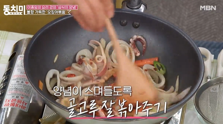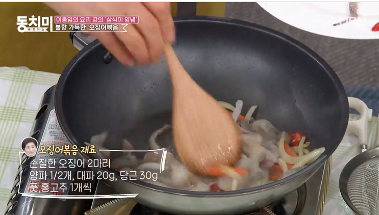 오징어 볶음은 손질오징어 2마리, 양파 반개, 대파 20g, 당근 30g, 홍,풋고추 각 1개씩 재료를 준비하고 준비한 재료를 먼저 볶습니다. 양념을 넣으면 타기 때문에 오징어가 충분히 익을 때까지 볶은 후 삼식이 양념을 넣는 것이 포인트라고 합니다.
