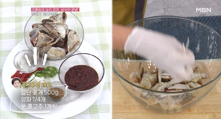 꽃게무침에는 절단꽃게 500g에 양파1/4개, 풋, 홍고추 1개씩 넣고 무치면 끝입니다.