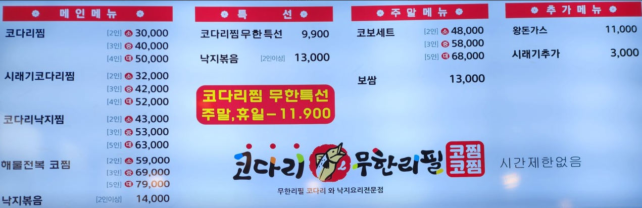 무엇보다 평 일 9,900원이라는 초저가에 무한리필로 제공되는 코다리찜은 그야말로 혜자스러운 선택이죠.