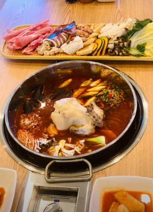 삽다리닭칼국수는 풍성한 닭과 다양한 해산물, 신선한 채소가 듬뿍 들어가 있어 얼큰하고 개운한 맛을 자랑합니다. 특히, 마지막에 면이 퍼지지 않고 쫄깃한 식감이 남아 있어 해장용으로도 인기가 높습니다. 이용객들은 셀프 바에서 부침개를 직접 구워 먹는 경험을 할 수 있어 특별한 재미도 느낄 수 있습니다.