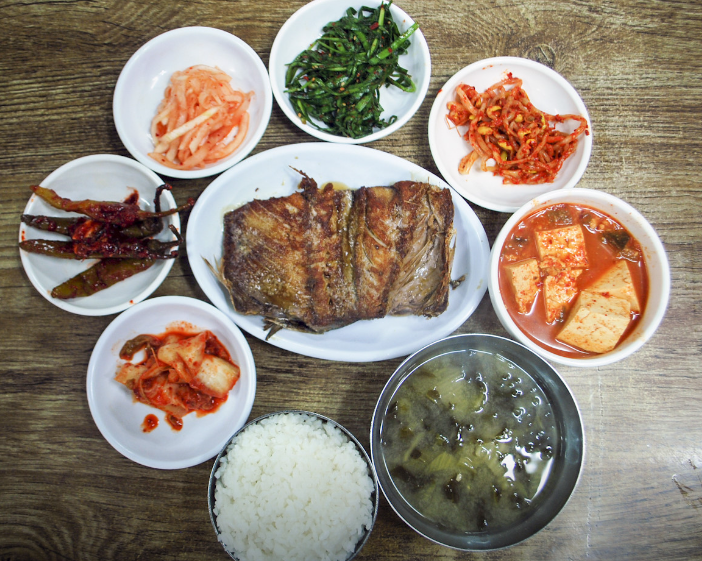 오복식당은 고등어구이와 갈치구이 등 신선한 해산물을 중심으로 한 정식 메뉴를 선보입니다.