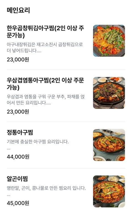 한우곱창튀김아구찜, 우삼겹염통아구찜, 전통아구찜이 주 메인 요리네요. 정말 특이하면서 맛이 궁금합니다.