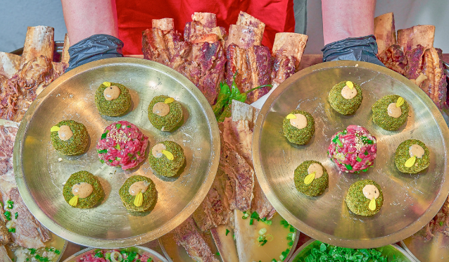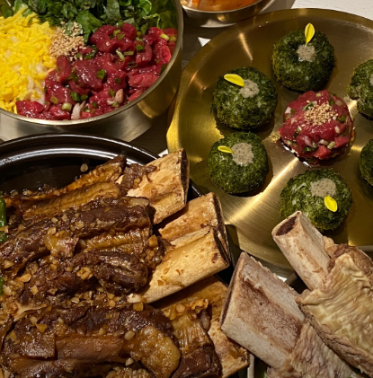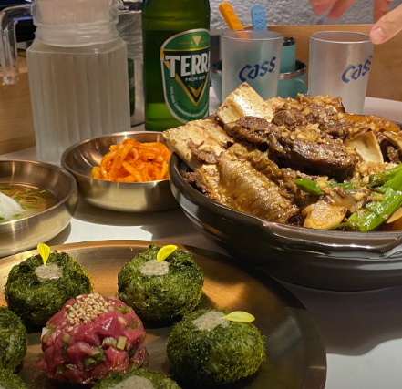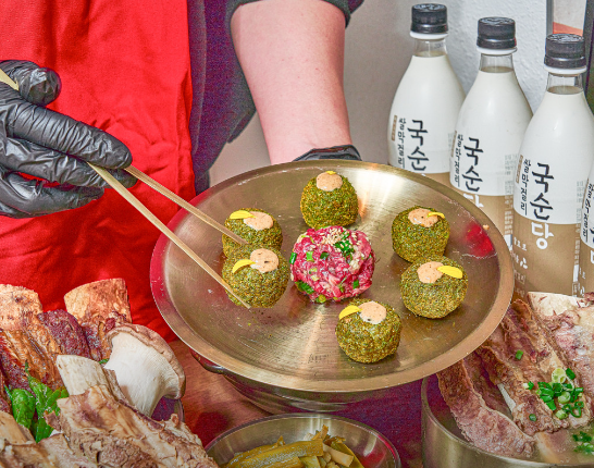 흑임자 소스를 올린 감태주먹밥을 육회와 함께 즐기는 메뉴