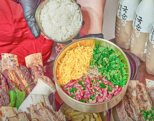 쫄깃한 냉장 육회와 특제 소스가 만나 고소한 맛을 살린 비빔밥