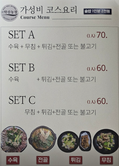 수육부터 무침, 튀김, 전골이나 불고기까지 맛 볼 수 잇는 가성비코스부터 별미류까지 메뉴 구성이 다양해서 선택의 폭도 넓어서 좋을 것 같습니다.