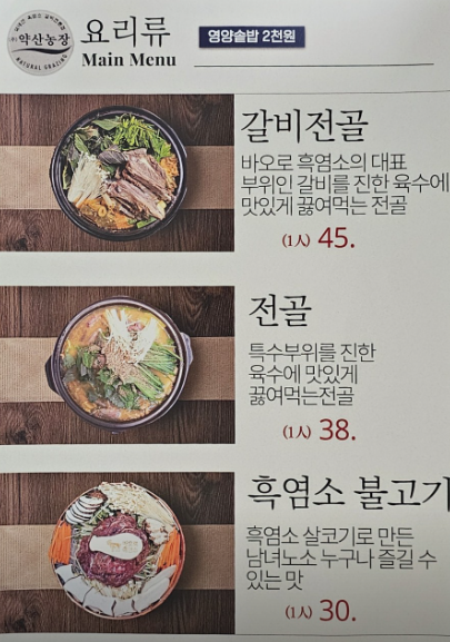 요리류로 갈비수육부터 갈비전골까지 다양한 흑염소요리를 맛 볼 수 있는 곳입니다.