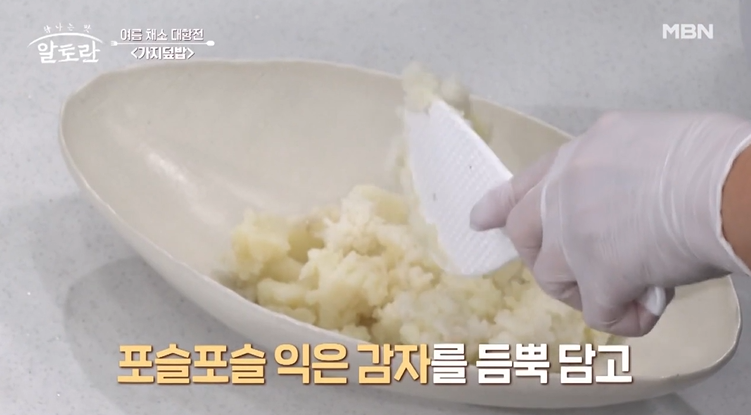 이제 감자밥이 완성되면, 구수하고 부드러운 감자밥을 그릇에 담습니다.