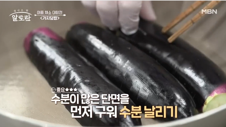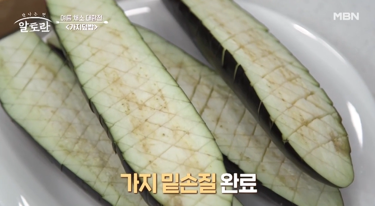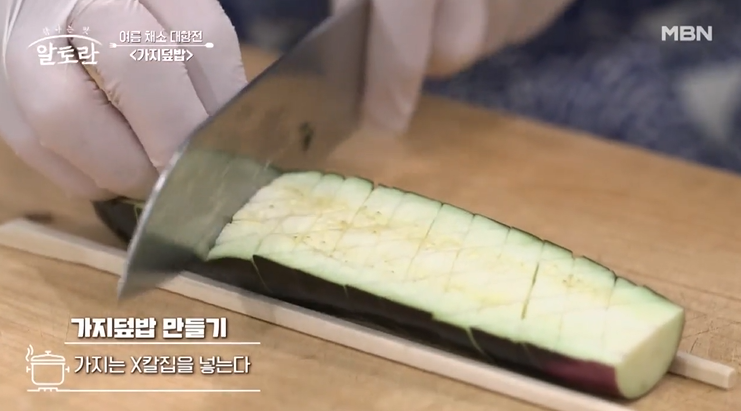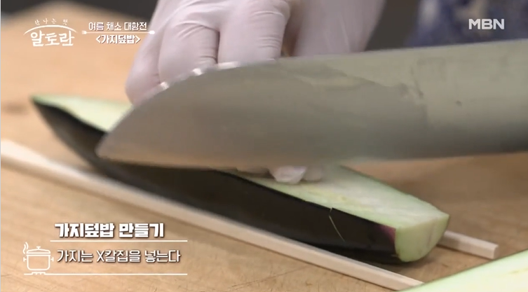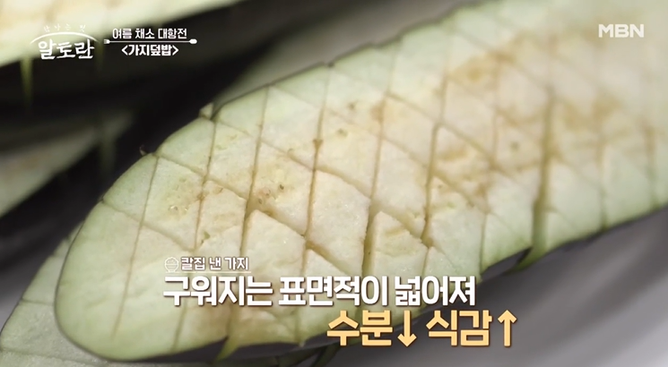 익으면 물러지는 가지의 식감을 위해 수분제거는 필수인데, 칼집은 넣으면 구워지는 표면이 넓어져 수분이 적어지고 식감은 좋아진다. 그리고 양념도 잘 배고 비주얼까지 잡는 비법이다.