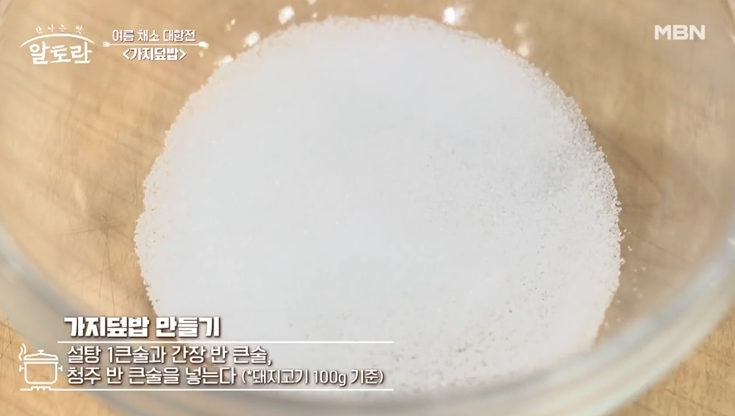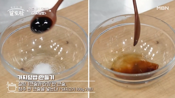 설탕 1큰술과 간장 반큰술, 청주 반 큰술을 넣는다(돼지고기 100g 기준)