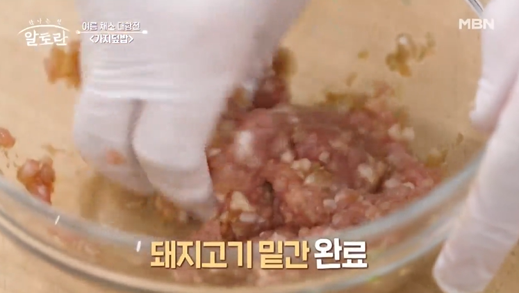 다진 돼지고기 100g 넣어 버무려 돼지고기 밑간을 완료한다.