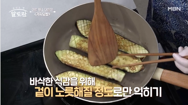 기름을 두른 팬에 칼집 넣은 가지를 굽는다. 이때, 수분이 많은 단면을 먼저 구워 수분 날리기를 한다.