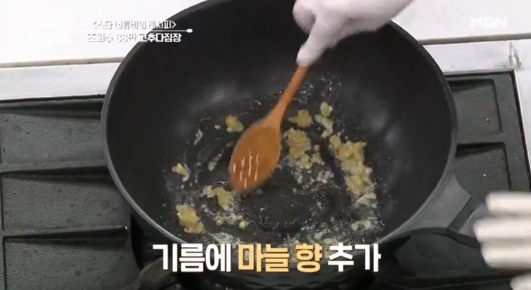 마늘 기름을 내는 이유는 깊은 맛을 내고 고추의 매운 기를 빼주는 역할을 하기 때문이다.