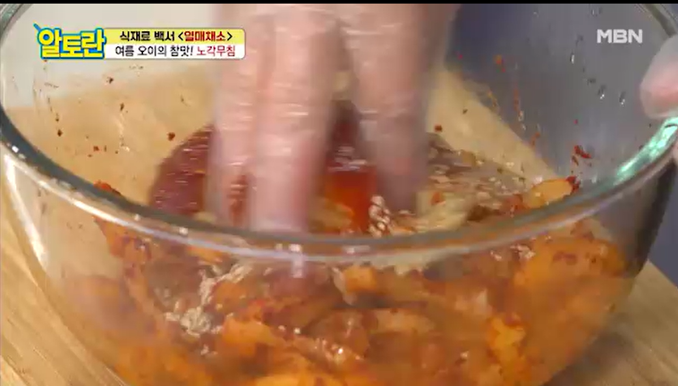 알토란 노각무침의 매콤하면서도 새콤달콤한 맛을 한층 더해줍니다. 방송에서는 골뱅이 무침 냄새가 난다고 합니다.