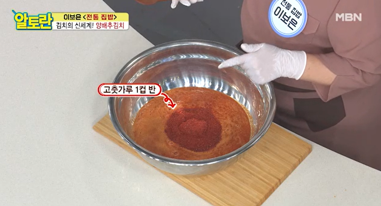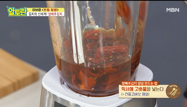 고추가루를 넣지 않고 건고추로 하는 것은 칼칼 달큰한 맛, 양배추의 비린내 제거, 깊고 진한 맛을 위해서이다.