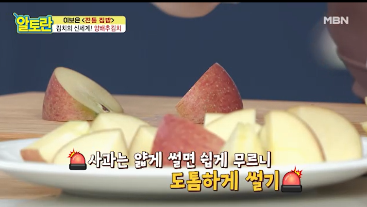 사과는 도톰하게 썰기한다. 얇게 썰으면 물러지기 때문이다.