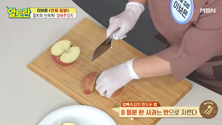양배추김치에 비법 재료인 사과를 넣기 위해 사과를 손질한다.