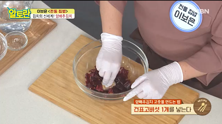 건표고를 함께 갈아서 사용하면, 양배추김치의 맛이 떨어지기 때문에 꼭 제거하고 갈아서 사용한다.