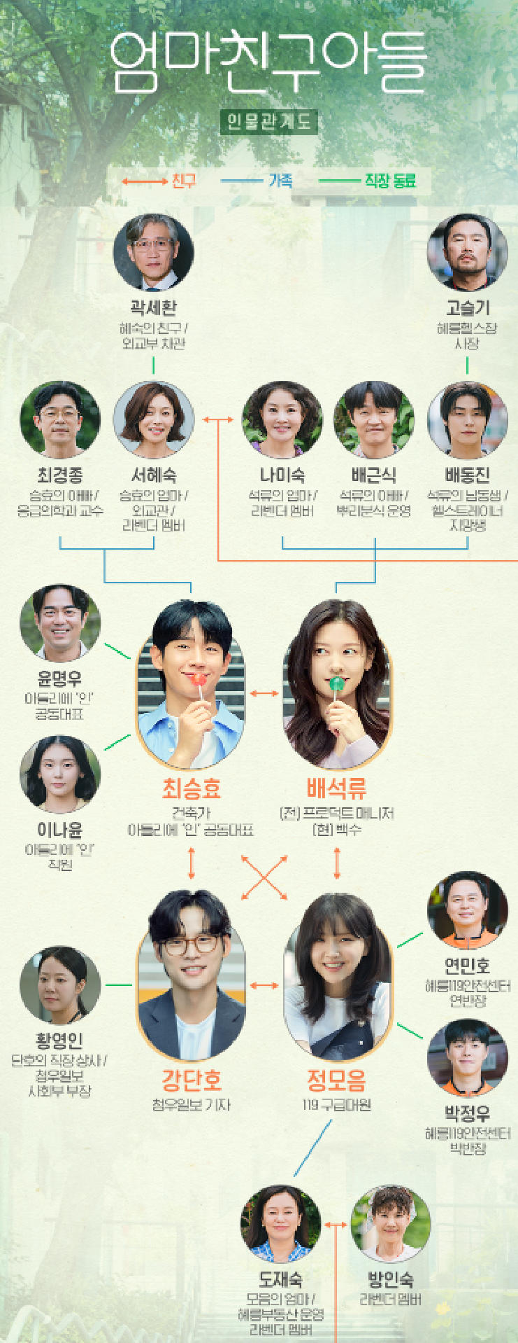 최승효와 배석류를 중심으로 이들의 가족, 친구, 직장 동료들과의 관계를 시각적으로 표현한 것입니다. 엄마친구아들 인물관계도를 파악하시면 드라마를 볼 때 재미가 두배가 됩니다.