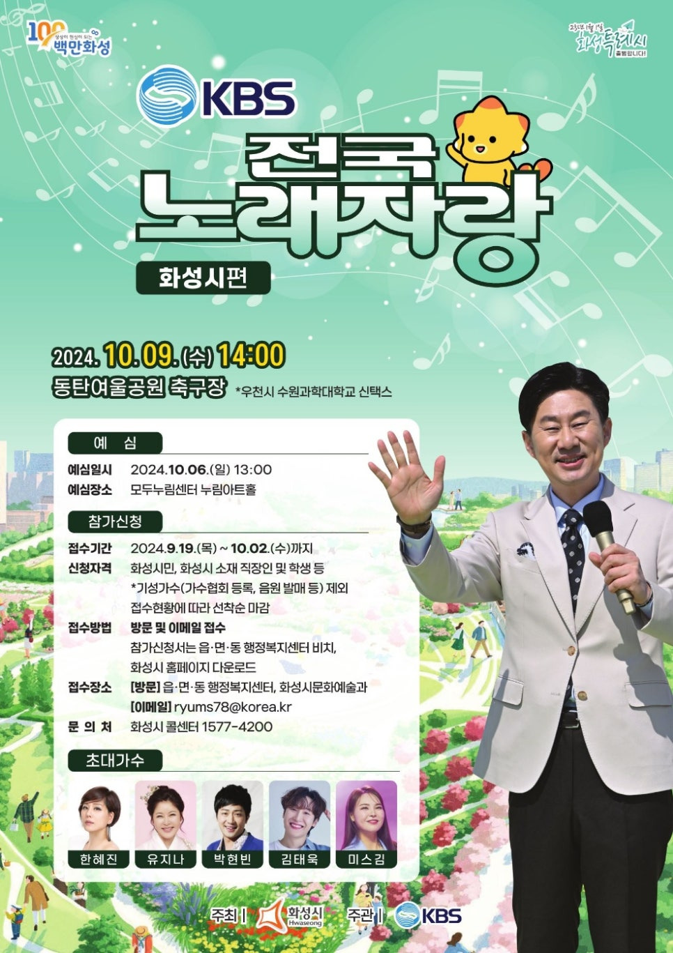 화성시는 10월 9일 동탄여울공원에서 KBS 전국노래자랑 화성시 편을 녹화한다고 발표했습니다. 이번 행사는 2014년과 2015년 이후 10여 년 만에 다시 화성시에서 열리며, 2025년 예정된 화성특례시 출범을 알리고 시민들에게 문화적인 즐거움을 제공하기 위해 기획되었습니다.