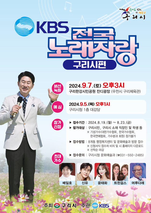 MC 남희석의 진행으로 매주 일요일 낮 12시 10분에 방영되는 이 프로그램은 전국의 숨은 노래 실력자들이 한자리에 모이는 무대로, 이번에는 구리시에서 녹화진행됩니다. 본선 녹화에서는 배일호, 신유, 윤태화, 트윈걸스, 머루다래와 같은 인기 가수들의 특별 공연이 예정되어 있어 한층 더 다채롭고 풍성한 무대를 기대할 수 있습니다. 다양한 장르의 음악과 개성 있는 참가자들이 펼칠 무대는 보는 이들의 마음을 사로잡을 것입니다. 또한, 구리한강시민공원 잔디광장에서 자연과 함께 즐길 수 있는 축제 같은 분위기는 시청자들에게 더욱 특별한 경험이 될 것입니다.