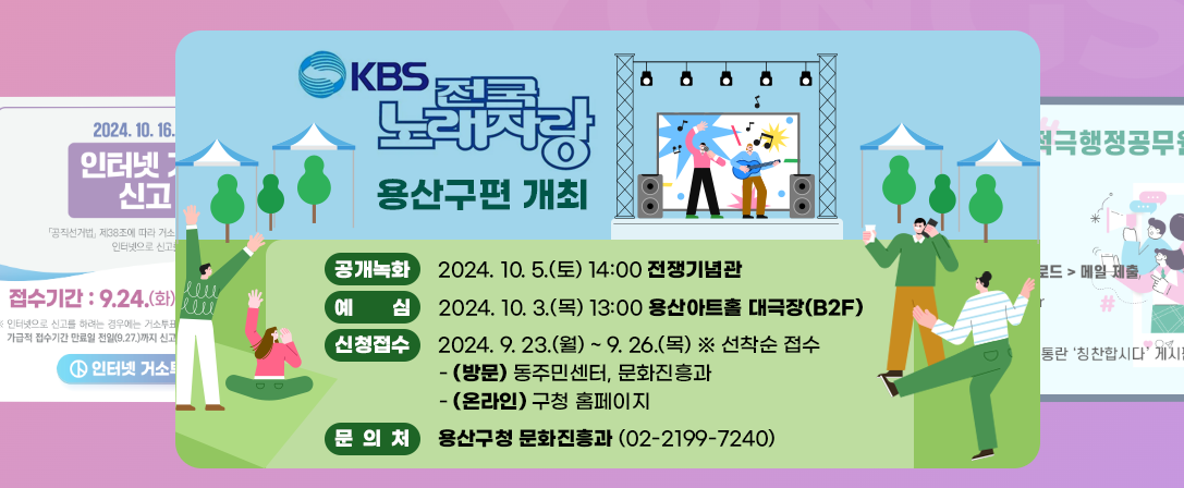이번 전국노래자랑은 그동안 숨겨왔던 여러분의 노래 실력과 끼를 마음껏 발휘할 수 있는 최고의 무대가 될 것입니다. 용산구의 새로운 스타가 될 수 있는 이번 특별한 순간을 놓치지 마세요!