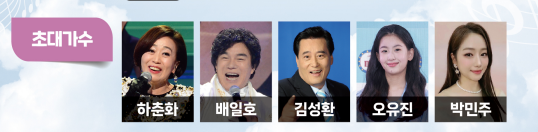 먼저, 한국 트로트의 살아있는 전설인 하춘화가 깊이 있는 목소리로 감동을 전할 것이며, 힘차고 에너지 넘치는 무대를 선보일 배일호는 대중의 사랑을 받아온 트로트 스타로서 큰 활약을 할 것입니다. 또한 다재다능한 예능인 김성환은 감성적인 노래 실력을 선보이며 매력을 더하고, 트로트 신동으로 주목받고 있는 오유진과 감성적이면서도 파워풀한 가창력을 겸비한 박민주 역시 무대를 한층 빛낼 예정입니다.