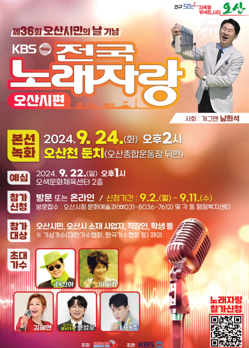 오는 9월 24일, 오산천 둔치(오산종합운동장 뒤편)에서 제36회 오산 시민의 날을 기념하는 특별한 행사가 열립니다. 바로 우리 모두가 즐겨보는 국내 최장수 인기 프로그램, KBS 전국노래자랑이 우리 오산시에서 녹화된다고 하는데요! 이번이 오산시에서 전국노래자랑이 열리는 네 번째 기회로, 2001년, 2007년, 2014년에 이어 올해 다시 찾아온 만큼, 시민들의 많은 참여와 관심이 기대됩니다.