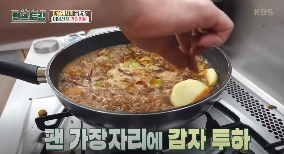 끓기 시작하면, 팬 가장자리에 감자를 넣는다.