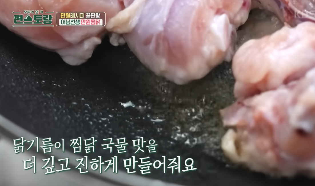 1분 정도 구워지면, 닭기름이 나온다. 이 닭기름은 찜닭 국물맛을 더 깊고 진하게 만들어 주기 때문에 닭기름을 절대 버리지 않는다. 이것이 맛의 포인트라고 한다!!!